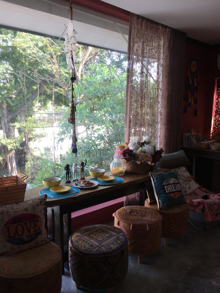 I split the trip into spending two days with a friend’s family at their b&b and two days at a hotel in central Bangkok. The b&b, which they call Aiyanna Handmade Hostel, is nothing like a hostel. It’s a joyful mix of bohemian and modern decor that makes each nook of the property distinctly unique. We no sooner dropped our bags off in the “Audrey Suite,” that we were seated in the main room on tapestry covered stools with dream catchers hanging overhead for a welcome lunch. Unexpected and delightful.