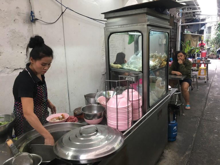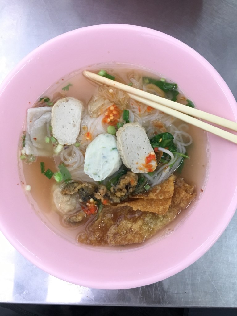 We took left turns, right turns, back-tracked, walked in circles, taking in all the food stalls and the frenzied bartering. We had no destination in mind, only the desire to explore and discover more deliciousness. As the afternoon wore on and we needed to find a place for lunch, we asked a local man where he eats and he pointed us down an alley to a noodle cart. He did not lead us astray. English was not spoken so we simply pointed to a few ingredients, were ushered to a metal folding table and plastic stools and waited for a steaming bowl of noodles to arrive. From a pastel pink bowl we devoured a porky, brothy heap of noodles, dotted with fresh seafood dumplings, sprouts, scallions, Thai chilies (a staple) and crispy fish skin. OMG. It was heaven and you guessed it, only cost $1. My love for Bangkok street food has been solidified.