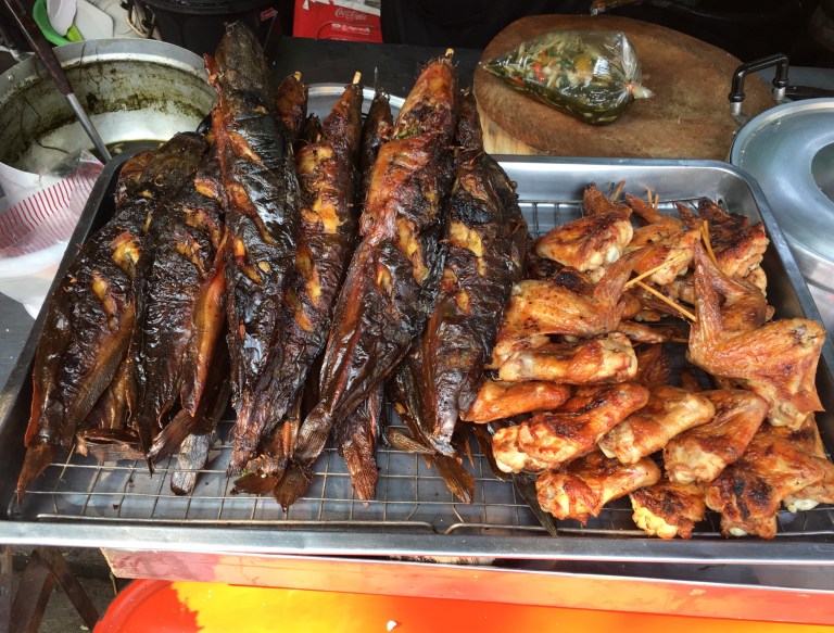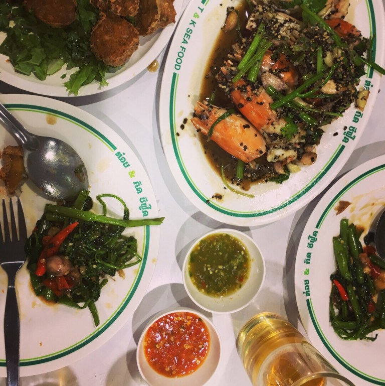 Again, metal tables, plastic chairs. Moments after sitting dishes start arriving one at a time until you have an array of glorious fire-grilled, pan-fried awesomeness. One of the meal highlights of the whole trip was the black pepper prawns and sautéed morning glories (a vegetable, not flower on this side of the world.) We dug in, letting juice drip down our elbows, ignoring the thin tissue napkins that dissolve as soon as you touch them — a useless offering to combat sauce-covered fingers. If you care about this sort of thing, bring your own. We splurged on this meal and spent $4, but that also included two cold waters and a large beer.