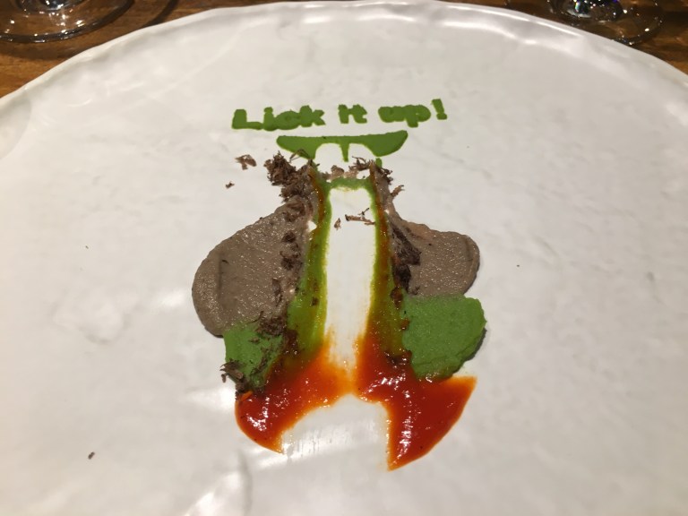Or maybe it was when we were asked to lick our plate dotted with three purées? I assure you this did not add to the experience, nor did the added element of them blaring the song “Lick it Up” by Kiss as we did so.