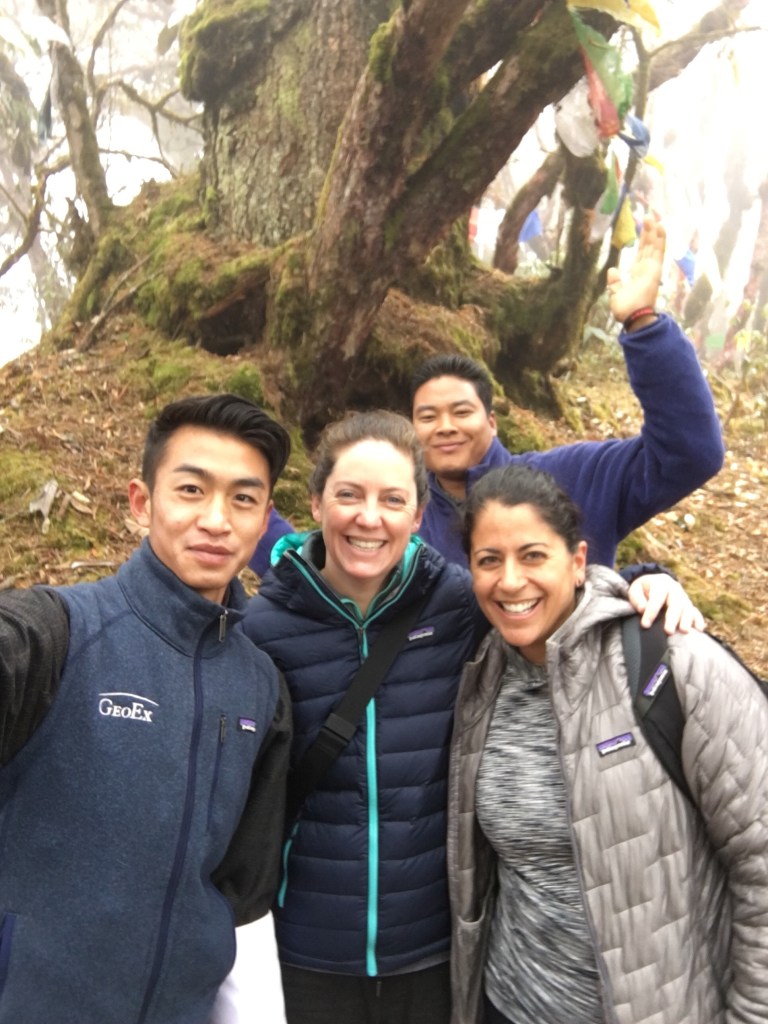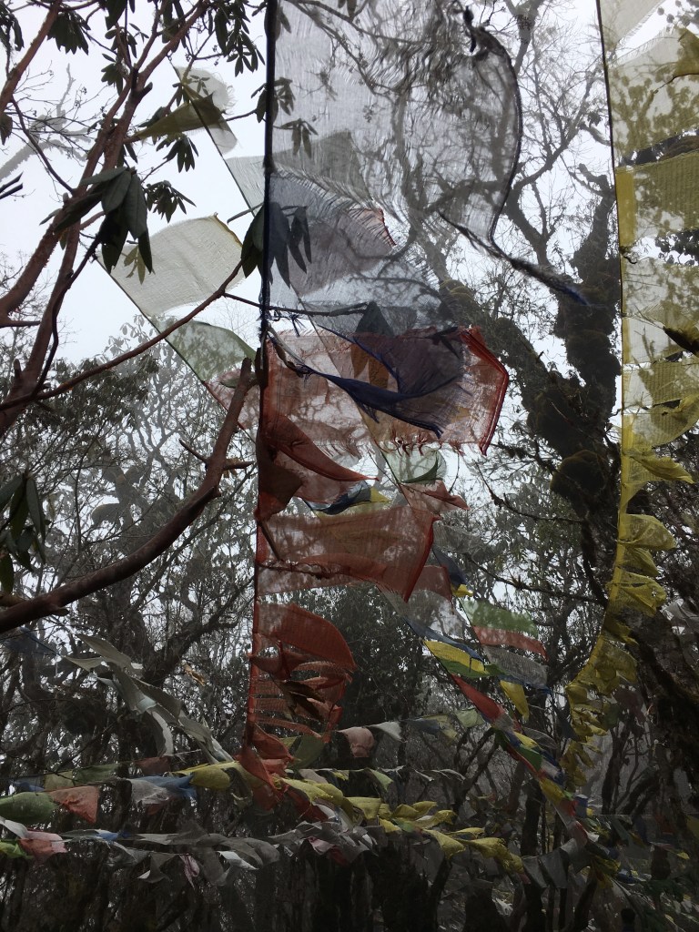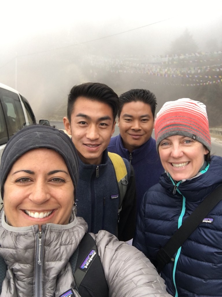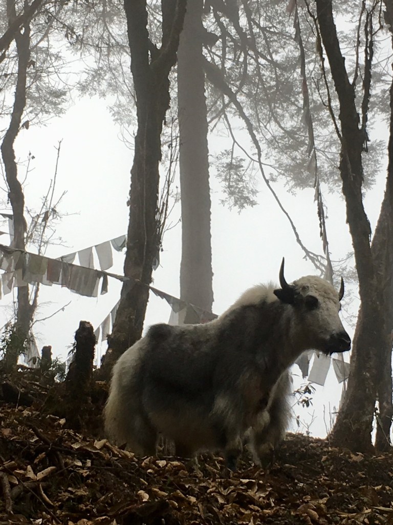 As we set out into the mist, Chencho taught us the chant “lha gaylo” which we shouted three times in unison to drive out the evil spirits (and hopefully the bears.) What we didn’t drive out was the herd of yaks, which we became CLOSE friends with. Throughout the hike Chencho and Jigme let out what can only be described as Bhutanese yoddles to announce our presence and perhaps scare off any unwanted to friends. And every so often I could hear Chencho singing a Bhutanese song behind me as four friends alone with their thoughts made the climb.