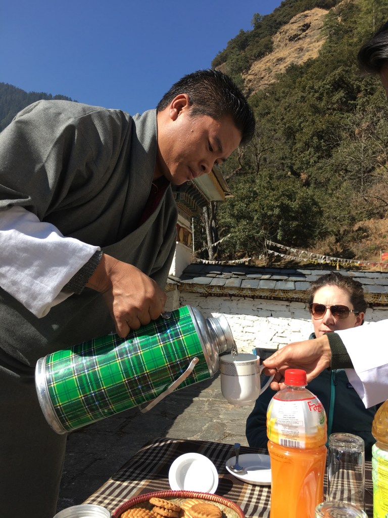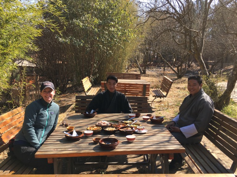 We no sooner sipped our tea and ate our biscuits that we hopped in the car and drove to eat a traditional Bhutanese lunch together. Outside. At picnic tables. With the sun warming our faces. In January. I’m going to take a break from describing how wonderful everything is, to describe how wonderful everything is in JANUARY. It’s winter here, but feels like the best Spring day in New York. It’s 60 degrees, the perfect cool-warm. The sky is the color you’d probably call periwinkle if you worked at Crayola, somewhere between lavender and blue. Why is this the off season? Why are there no tourists here right now? How did we plan this so perfectly without knowing we were doing so? Forget Spring or Fall when all the other people visit, come in January when you have this magical place all to yourself.
