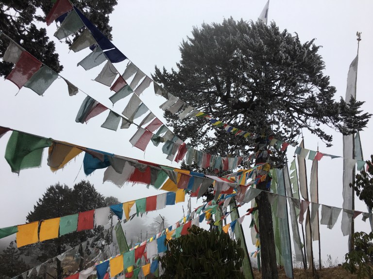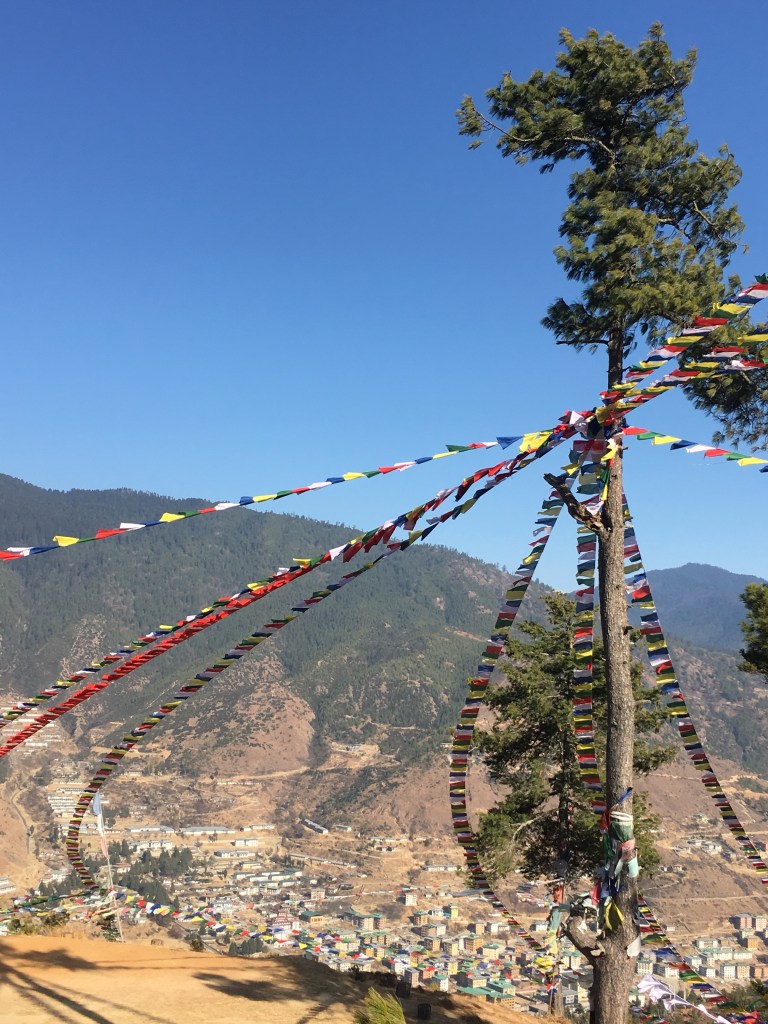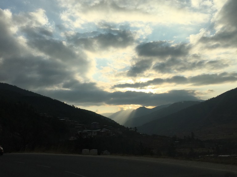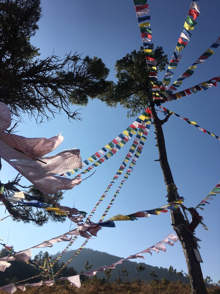 As you climb the winding, dusty path you try to remember to stop looking at your feet as they make the next step, but to look up and out at the horizon, the vibrant green mountains dotted with buildings in the traditional painted Bhutanese architecture, the sun rising over the furthest peak, the mist burning off from the higher altitude. You can’t capture this in photos (although I tried) as the magnificence is too great. And it’s not just about the visual, it’s about the smell of the trees, the smell of wood burning to warm houses in a distance, the warmth on your face from the sun, the gentle cool breeze reminding you it’s January, the sounds of long-tail birds singing in the trees above you, and the river rushing down below. It’s about the colorful prayer flags hung from tree to tree flapping in the wind. These vibrant flags wrapping the entire country like ribbon every direction you turn. Who left these flags? What were they praying for? What are your wishes at this moment? It’s the whole experience that can’t be described or understood unless your own two feet are standing there.