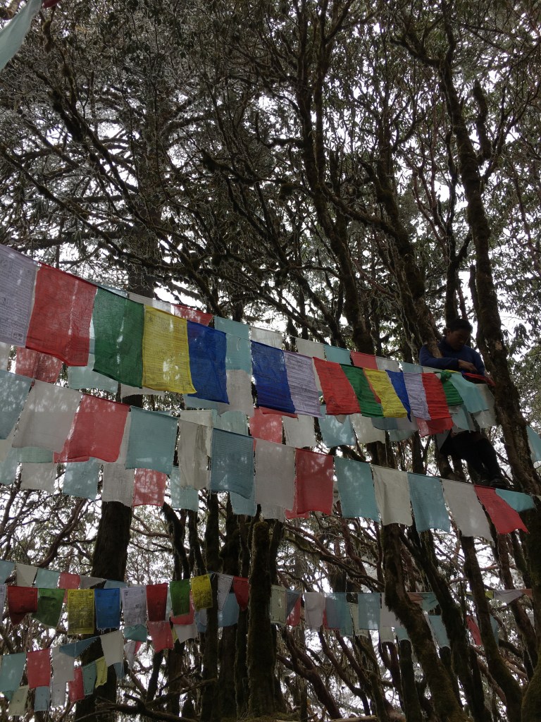 About halfway down we stopped to hang our own prayer flags that we had blessed by a monk. Chencho scaled a tree to secure good placement and we marveled at our unweathered flags, newly hung for eternity.