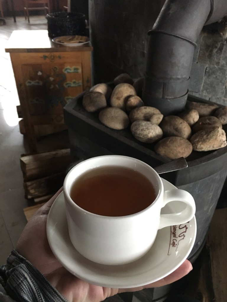 Ok, resume meal. As the four of us sat around our square wooden table, we were first served a cup of butter tea. I’ve never heard of butter tea before, but let me assure you this is another one of those things you want to bottle up and take home with you. The red tea leaves make the liquid a light pink, while the melted butter clouds it to an opaque, salty cup of warmth. I’ll have a refill please. And another.