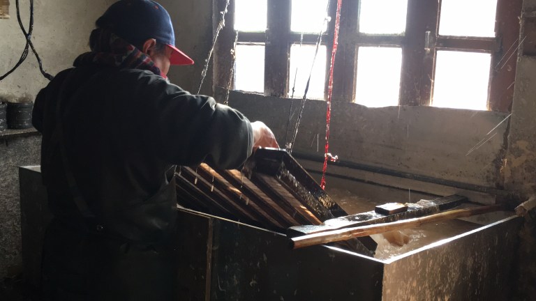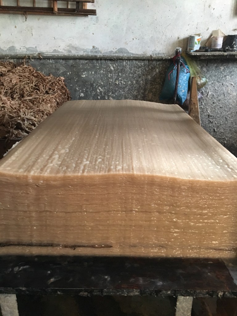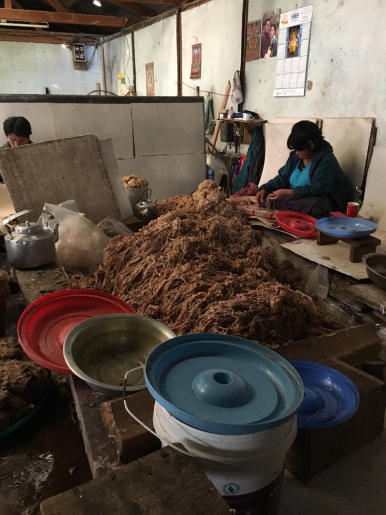 We visited a paper factory where the bark from the Daphne plant is soaked and softened in hot water over an open flame for hours, then each strand is painstakingly pulled apart by hand, before being fed through a shredder to create a wet pulp, which is then poured into a water bath and layered onto a screen to create each sheet. The sheets are covered in hibiscus oil to keep the paper from sticking together before being dried on vertical walls that are kept warm by a hot water heater. Let’s hope the internet doesn’t kill this craft.