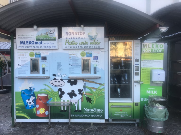 After recharging we spent the rest of the afternoon strolling along the river, popping into churches and markets and small local shops. Turns out they’re obsessed with dragons here. The dragon has been the symbol of Ljubljana ever since Jason of the Argonauts supposedly slew one in a nearby swamp. Favorite find of the stroll? The milk-o-mat where you can fill a glass jug with fresh milk for 1 euro.