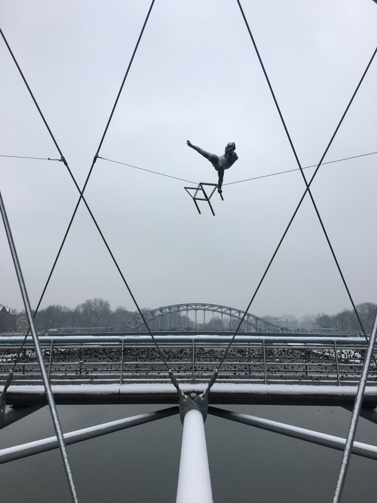 A walk to his factory takes you across a rather whimsical bridge with acrobats suspended on the suspension wires. A little levity before a somber afternoon. 🙂