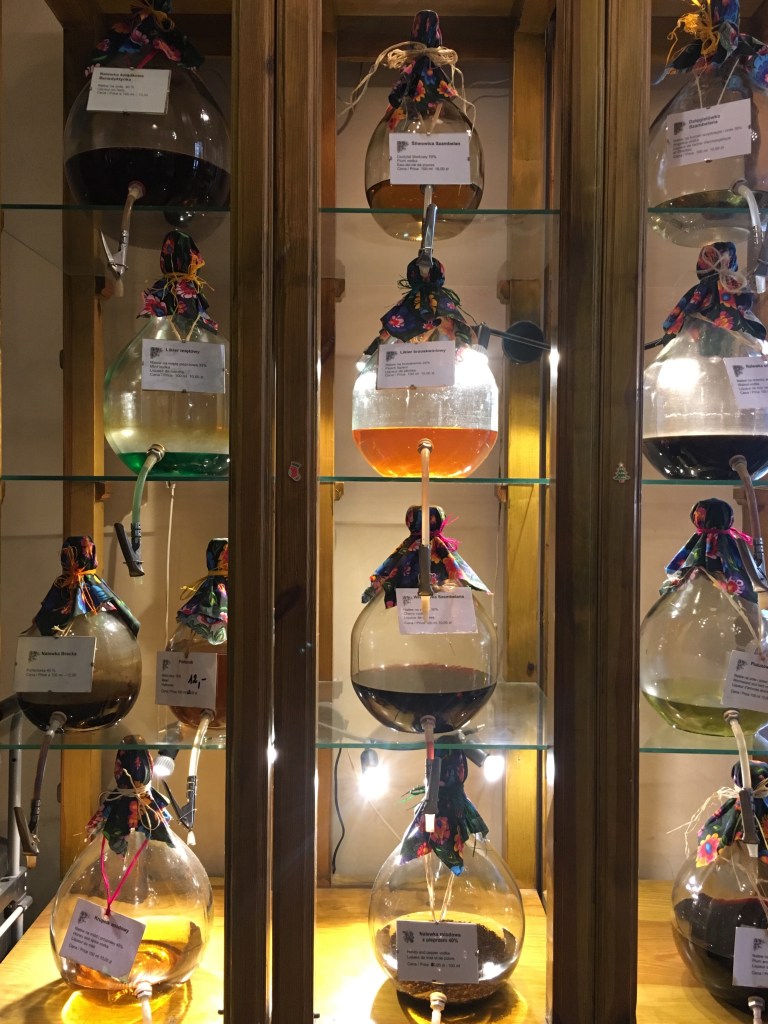 And lest you think Poland is only a somber, heavy place (except for the paczkis and pierogis) let me assure you there is so much more to lighten the mood and delight you. Old Town is an inviting square lined with cafes, pubs, shops, churches, more churches, a few more churches and photo-worthy pastel-faced buildings with tourist-yearning horse drawn carriages. It’s a place to stroll, shop, stop for a warm coffee or a frothy lager. A favorite stop that I stumbled into is a little vodka shop that makes shelves of infused wodkas ideal for taking a taste of Poland home (hi dad!) The 10am hour didn’t stop me from a tasting.