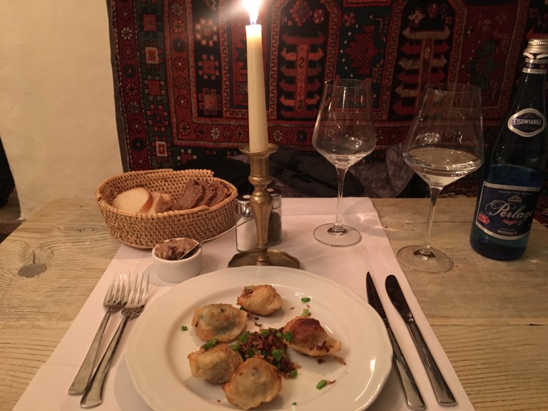 Last night I ate at a restaurant that’s also been around since the time of knights and armor. The interior dates back to the 13th century, inspiring a menu of medieval Polish dishes mostly consisting of a long list of meat like wild boar and deer, grilled over an open fire. When in Rome, right? Sitting in a cavernous room by candlelight, I ordered up a plate of their prized pierogi (apparently they place 1st in whatever competition exists to judge pierogis — side note, let’s figure out when that is and come back) and, of course, the wild boar. All of that washed down with a side of bread with lard spread and a shot of vodka “to help with digestion”. Mmmmm, lard. Mmmmm, vodka. I can’t imagine coming to Poland in the summer and eating this food. You need a good sturdy winter night to take down this cuisine. It’s just what I needed.