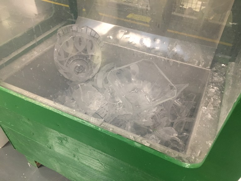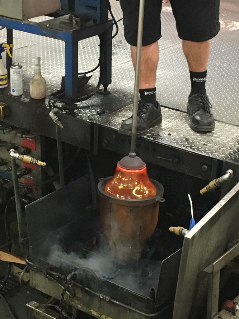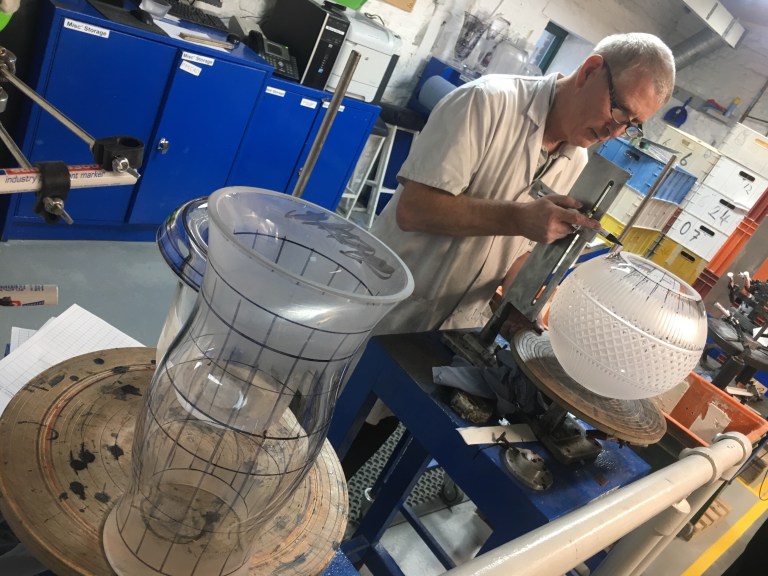 Each person who works in the factory is a specialized glass blower, etcher, carver or engraver — no person does more than a single job. Did you know they hand-draw the lines with marker before cutting? Good lord.