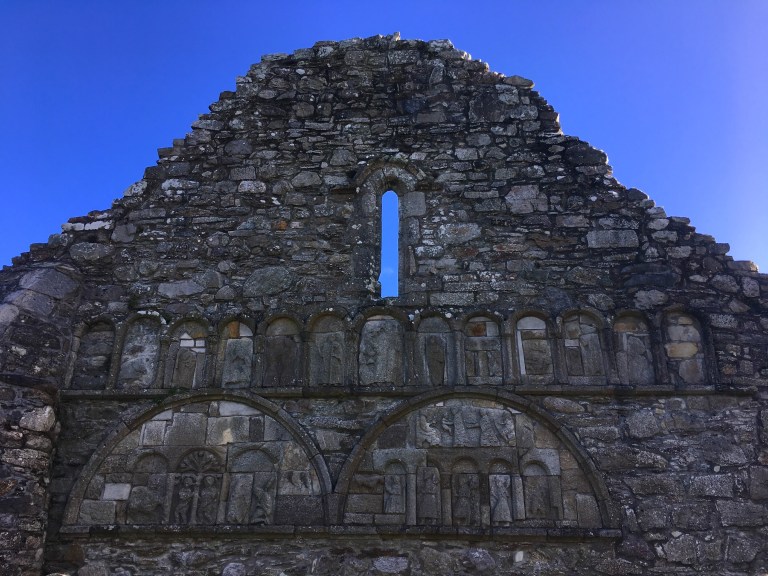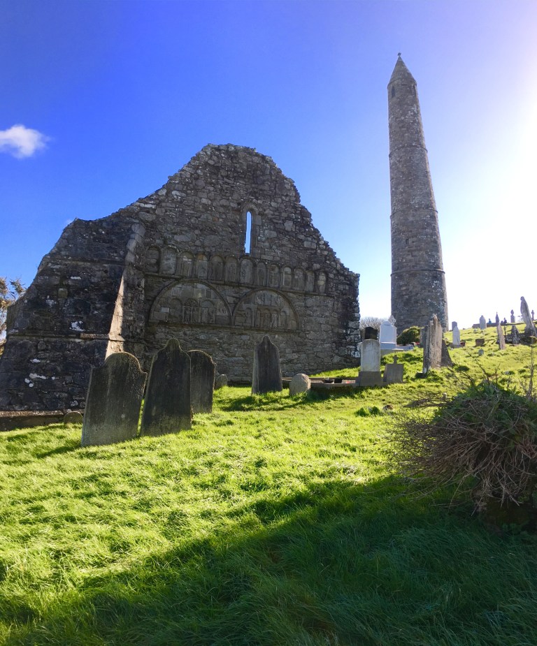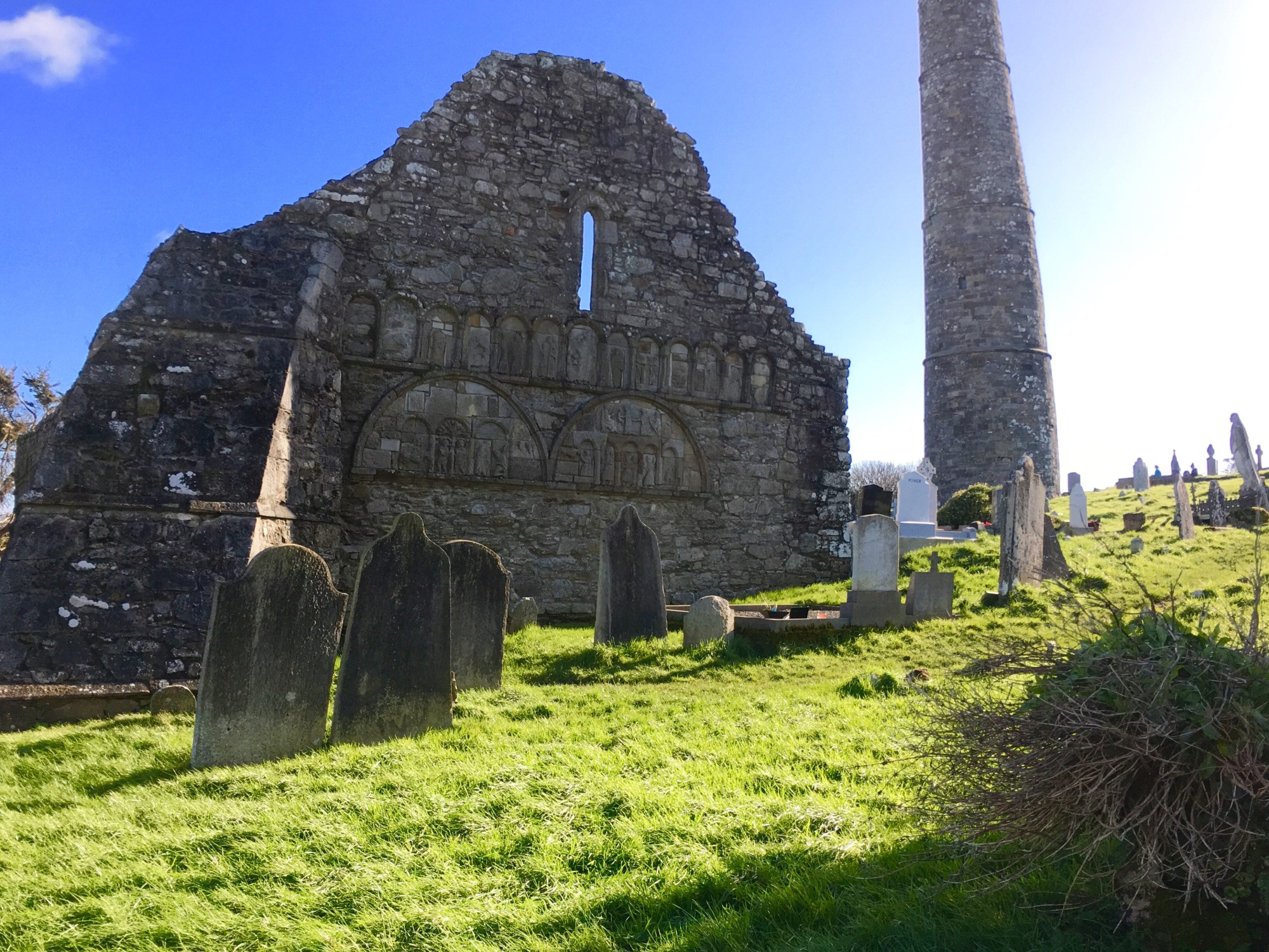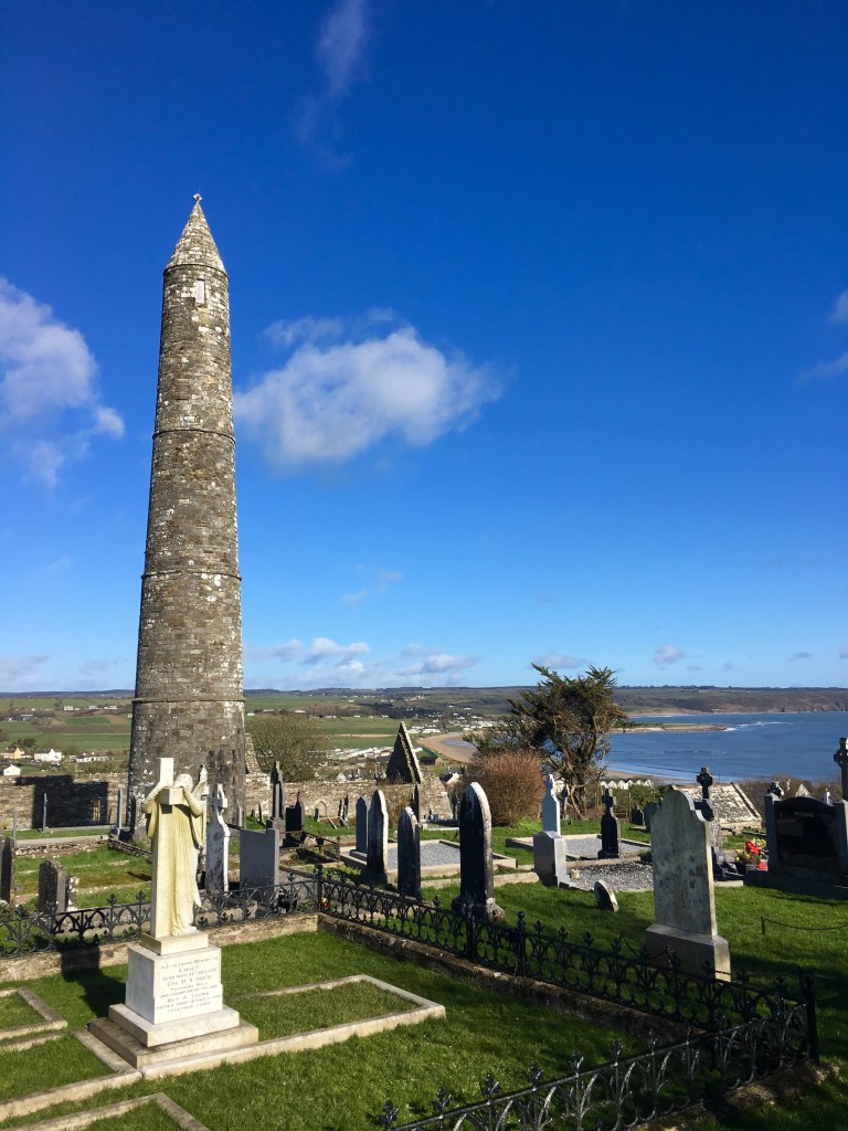 We loaded into their car and drove to Ardmore, meaning “high point,” and the site of St. Declan’s Cathedral and the most “modern” lookout tower in Ireland (ya know, from the 12th century.) All that remains of the Cathedral are a few walls from the 10th and 12 centuries, one of which still has slabs of stone depicting the stories of Adam & Eve and the birth of Jesus. Does anyone else agree that Ireland should change their flag to green, gray, and blue?