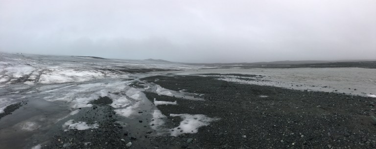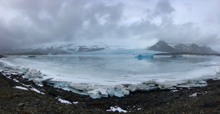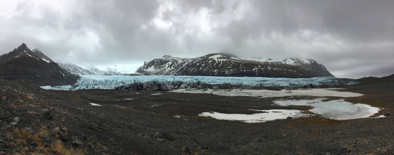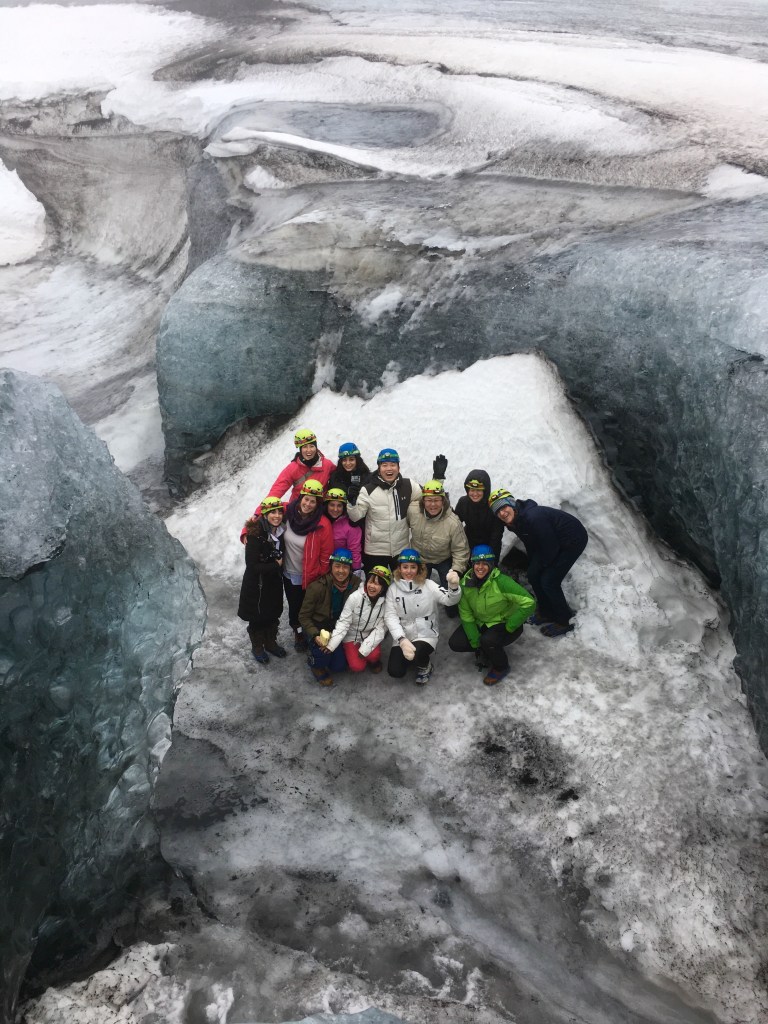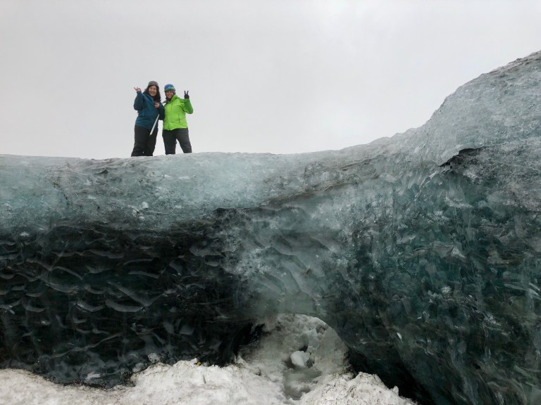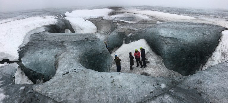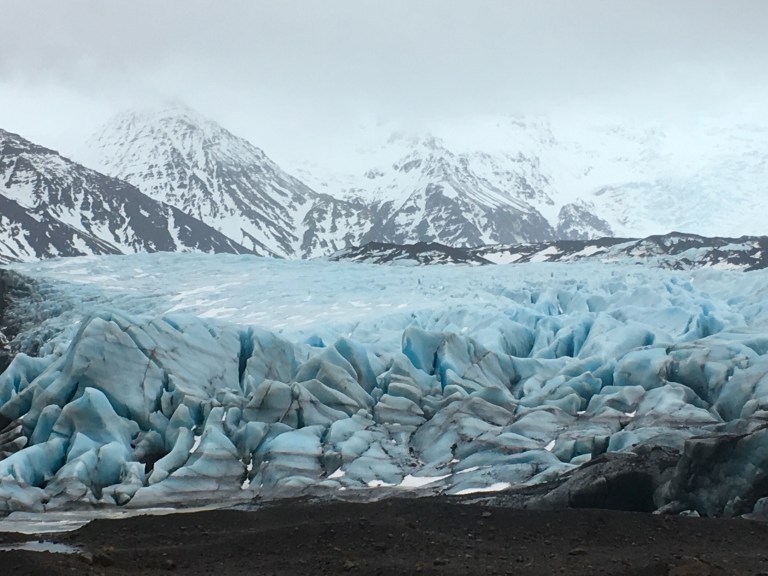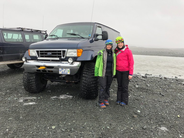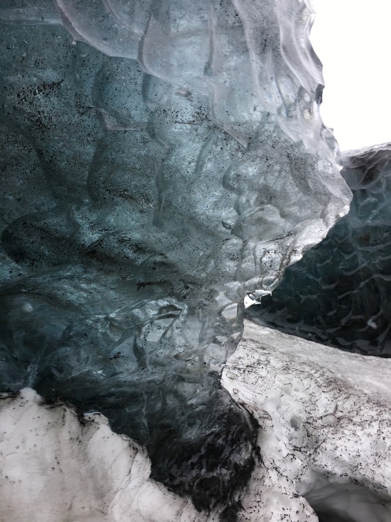 The good news: the rain stopped and we still got to pile in a monster truck, drive across the most moon-like surface we had seen yet, through rushing rivers and onto the largest glacier in all of Europe to do a little glacier walk and climb down into a moulin, a vertical well in a glacier formed when water enters from the surface. Icelandic glacial ice is like a perfect, clear cocktail ice cube. While most glacial ice has 20% air in it, Icelandic glaciers have been compacted so much there is only 5%, making it seem like you’re walking on clear glass. This was not a bad plan B.