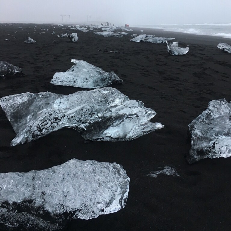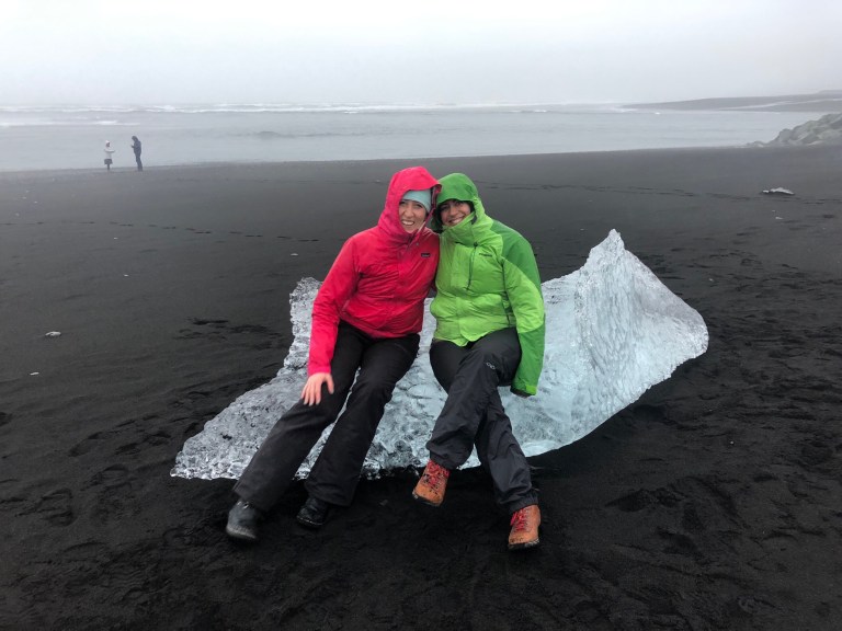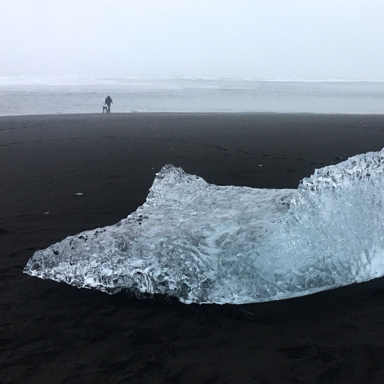 And that’s a wrap for day 1 of our road trip. No, not really, but what more is there to do after chowing on a famous gas station hot dog? From hot dogs to diamonds, we elevated the tour a bit at Diamond Beach, a beach covered in broken glacial ice that shines like a girl’s best friend against the stunning black sand. What a surreal beach to stroll — the photos look like they were taken in black in white, but they’re in full color. We didn’t see any proposals out there, but we did see a bride capturing a few shots in her dress, totally unbothered by the torrential downpour.