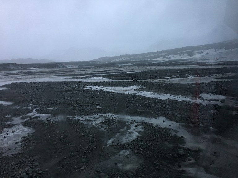 The next morning, 13 of our new best friends piled in a small sprinter van to drive the entire south coast over the next two days. As we set out, the clouds started to roll in and get progressively darker. A massive storm was brewing and Maria, our badass guide/driver/seeker of adventure, was determined to outrun as much of it as possible, but we didn’t make it too far before rain, hail, wind put a damper on our outdoor agenda. We paid a quick visit to the Eyjafjallajokull volcano that erupted in 2010 halting most northern air traffic and covered this entire area in volcanic ash.